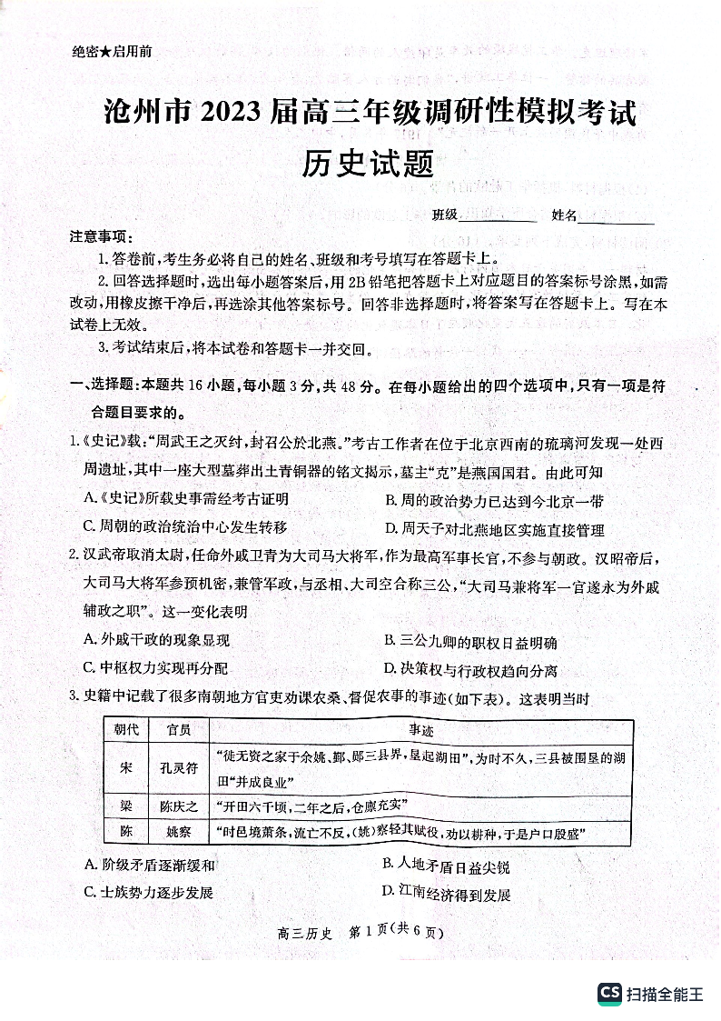 高三历史--河北省沧州市2023届高三调研性模拟考试(一模)