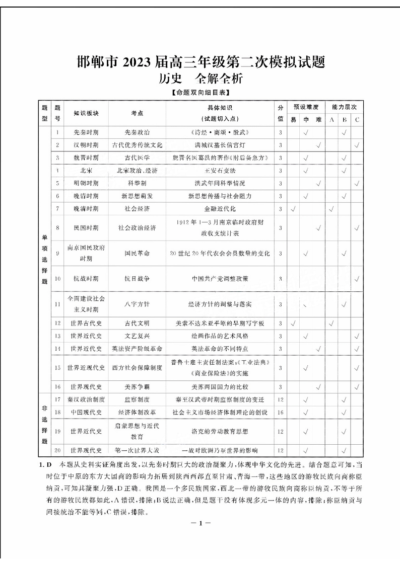 高三历史答案--河北省邯郸市2023高考二模