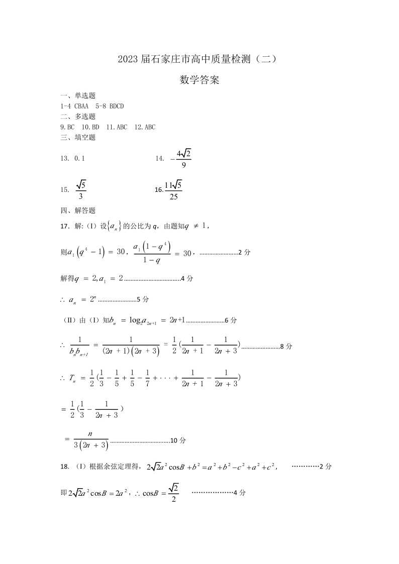 高三数学答案--河北省石家庄市2023届高中毕业年级教学质量检测(二)(石家庄二模)