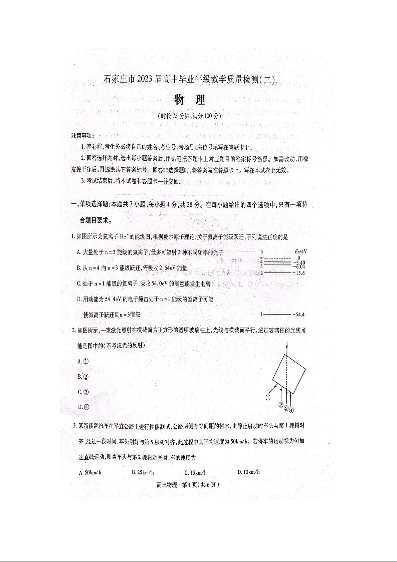 高三物理--河北省石家庄市2023届高中毕业年级教学质量检测(二)(石家庄二模)