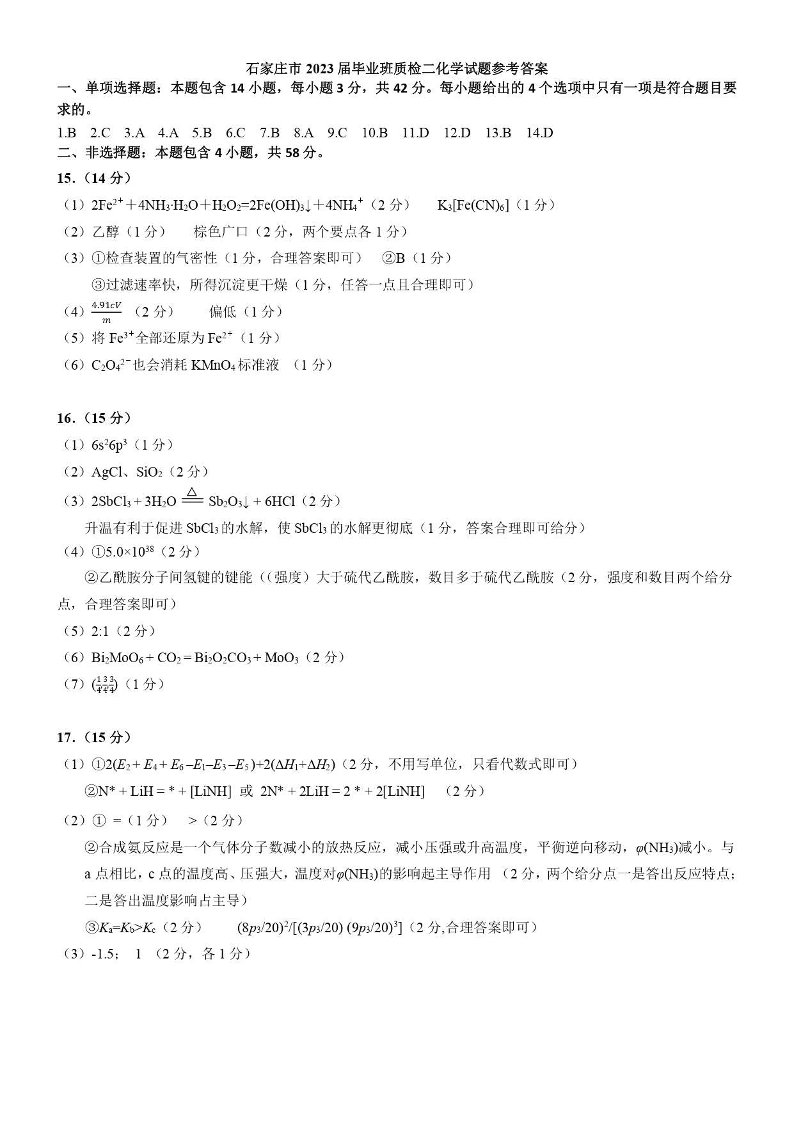 高三化学答案--河北省石家庄市2023届高中毕业年级教学质量检测(二)(石家庄二模)
