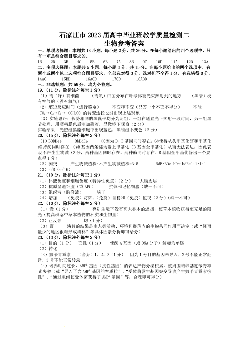 高三生物答案--河北省石家庄市2023届高中毕业年级教学质量检测(二)(石家庄二模)