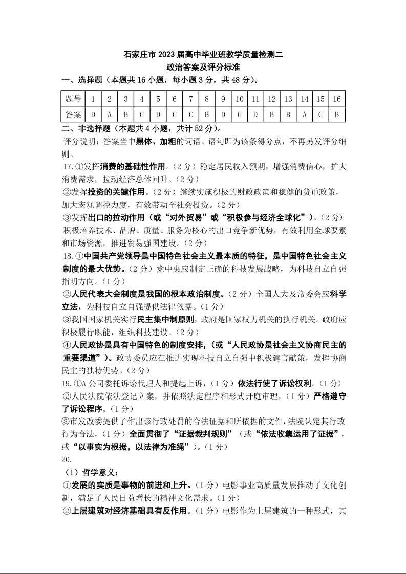 高三政治答案--河北省石家庄市2023届高中毕业年级教学质量检测(二)(石家庄二模)