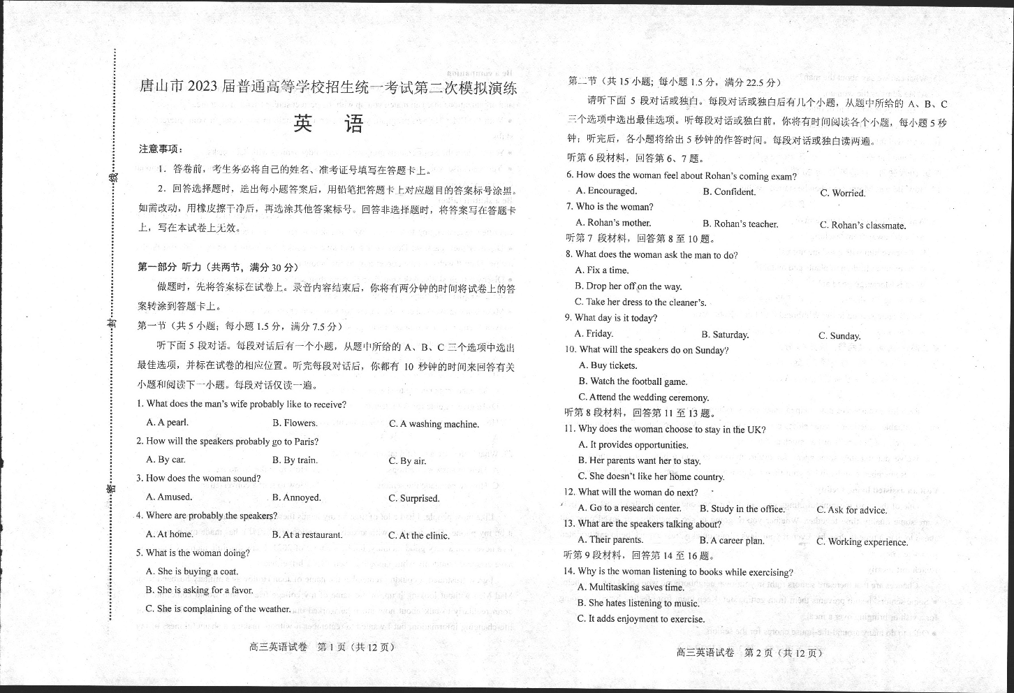 高三英语--河北省唐山市2023届普通高中学业水平选择性考试第二次模拟演练(唐山二模)