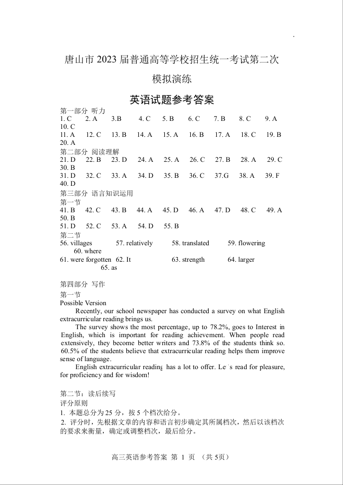 高三英语答案--河北省唐山市2023届普通高中学业水平选择性考试第二次模拟演练(唐山二模)