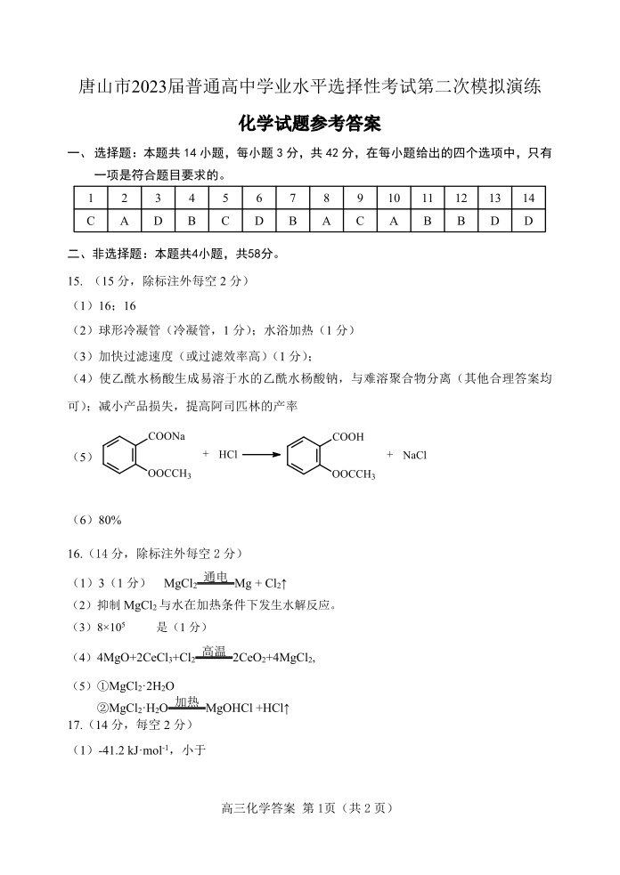 高三化学答案--河北省唐山市2023届普通高中学业水平选择性考试第二次模拟演练(唐山二模)