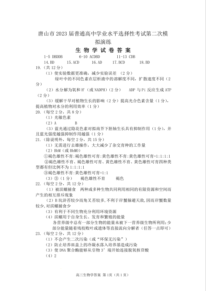 高三生物答案--河北省唐山市2023届普通高中学业水平选择性考试第二次模拟演练(唐山二模)