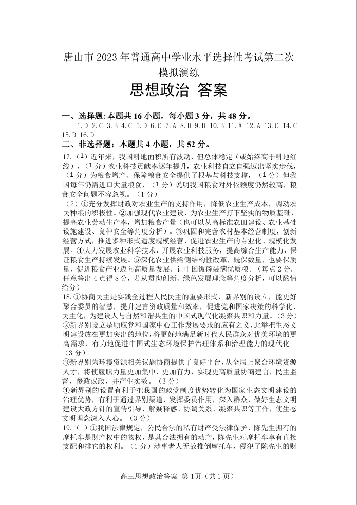 高三政治答案--河北省唐山市2023届普通高中学业水平选择性考试第二次模拟演练(唐山二模)