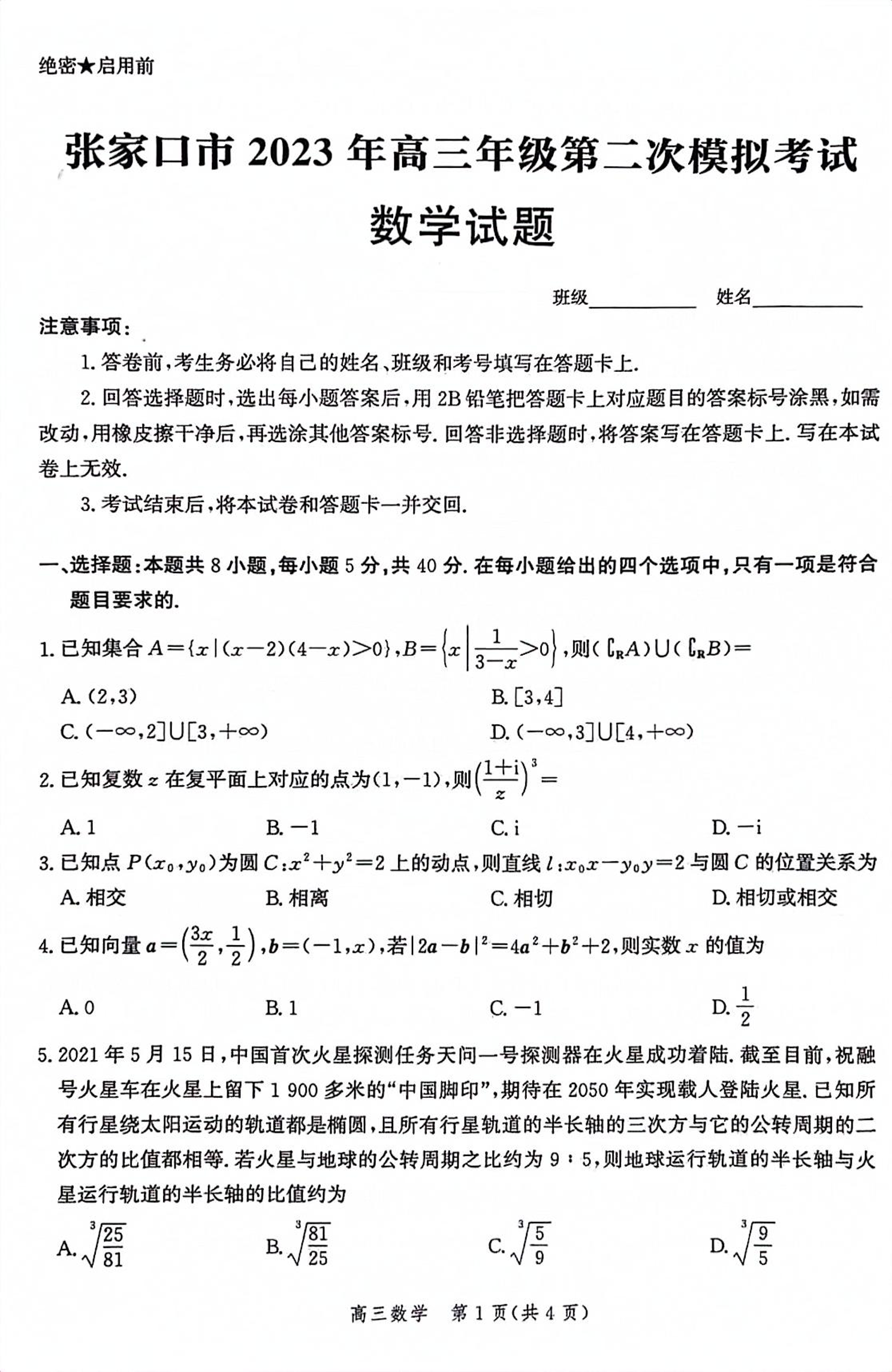 高三数学--河北省张家口市2023届高三二模