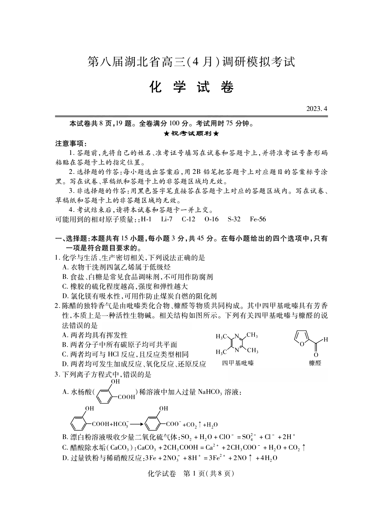 高三化学+答案--湖北省2023第八届高三(4月)调研模拟考试(全省地市联考)