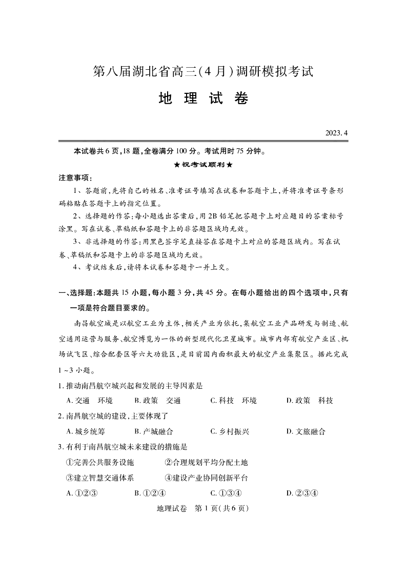 高三地理+答案--湖北省2023第八届高三(4月)调研模拟考试(全省地市联考)