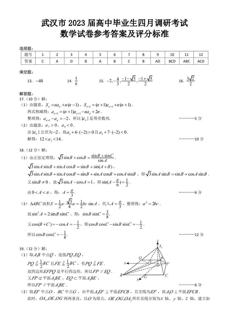 高三数学答案--湖北省武汉市2023届高中毕业生四月调研考试(武汉四调)