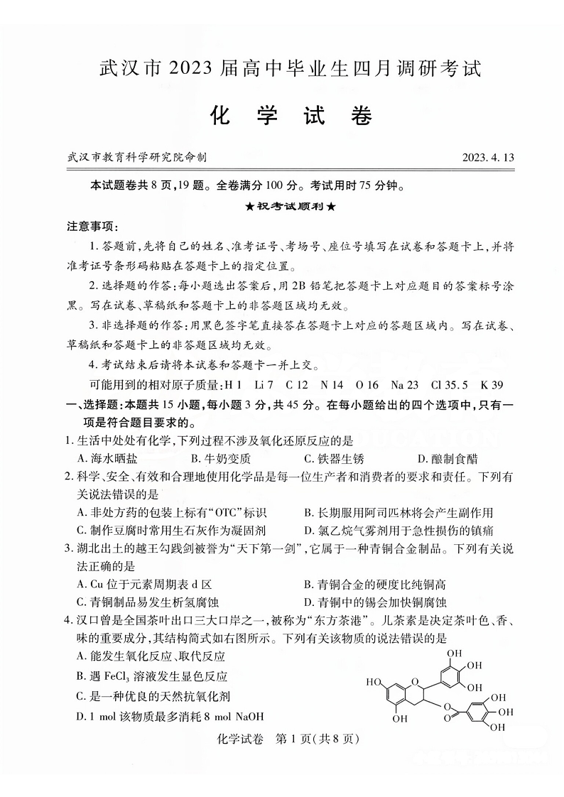 高三化学--湖北省武汉市2023届高中毕业生四月调研考试(武汉四调)