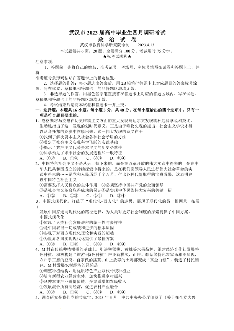 高三政治--湖北省武汉市2023届高中毕业生四月调研考试(武汉四调)