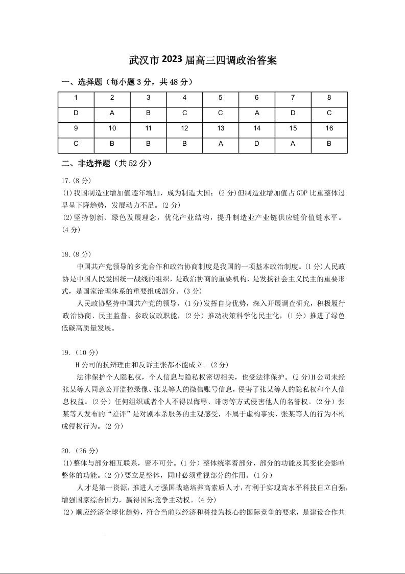 高三政治答案--湖北省武汉市2023届高中毕业生四月调研考试(武汉四调)