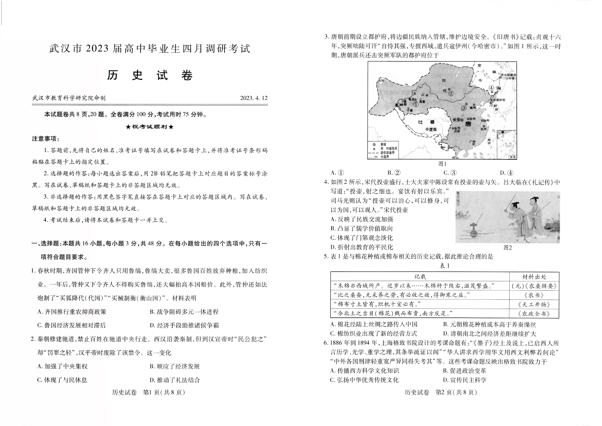 高三历史--湖北省武汉市2023届高中毕业生四月调研考试(武汉四调)
