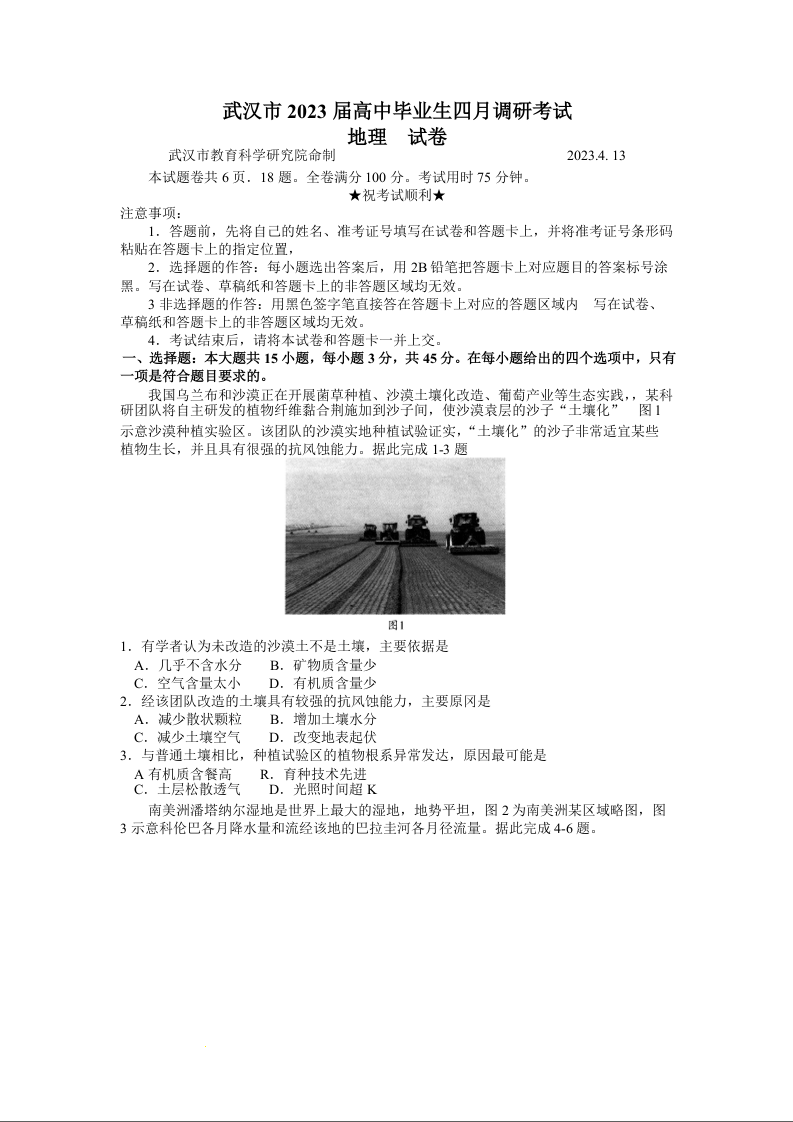 高三地理--湖北省武汉市2023届高中毕业生四月调研考试(武汉四调)