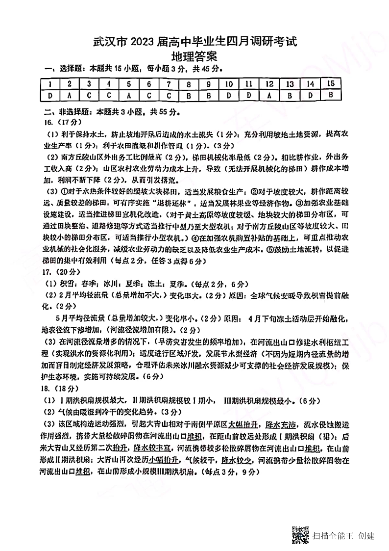 高三地理答案--湖北省武汉市2023届高中毕业生四月调研考试(武汉四调)