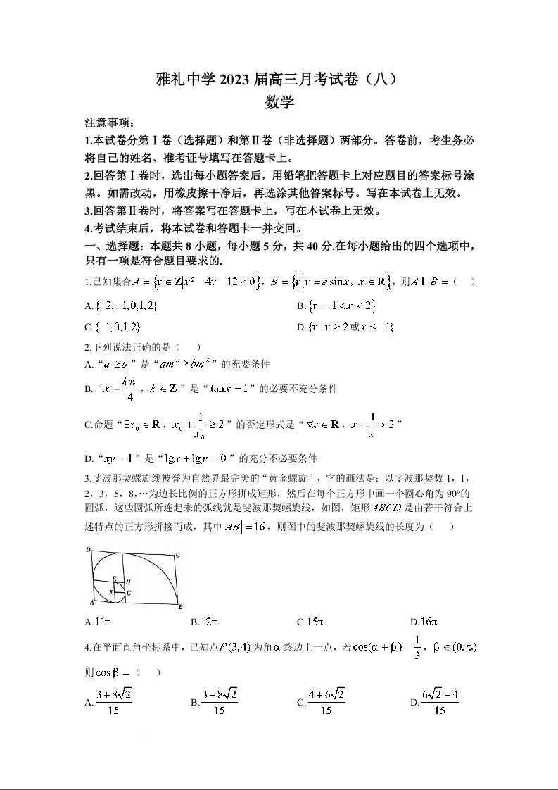 高三数学--湖南省长沙市雅礼中学2022-2023学年高三下学期月考(八)
