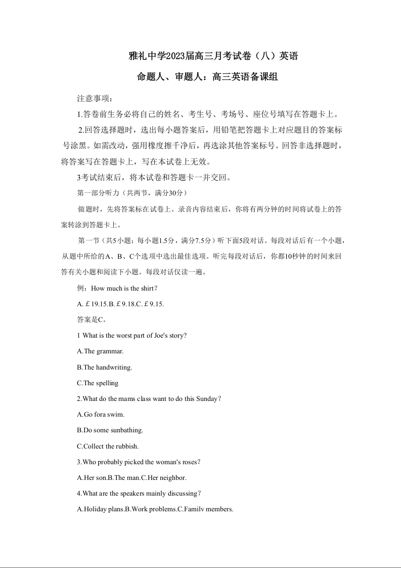 高三英语--湖南省长沙市雅礼中学2022-2023学年高三下学期月考(八)
