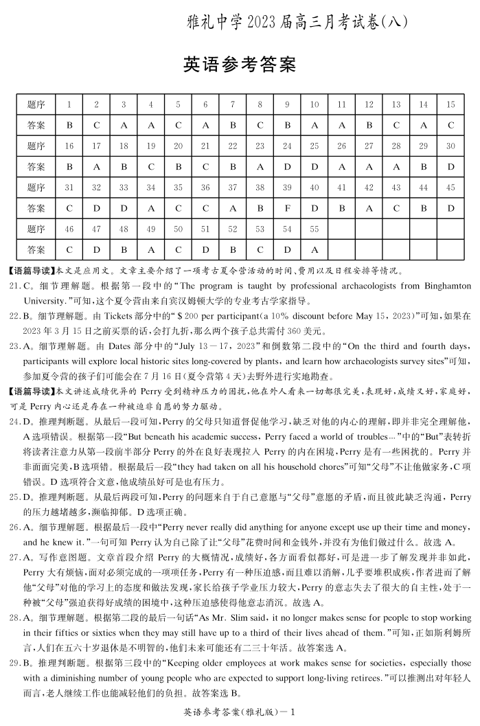 高三英语答案--湖南省长沙市雅礼中学2022-2023学年高三下学期月考(八)