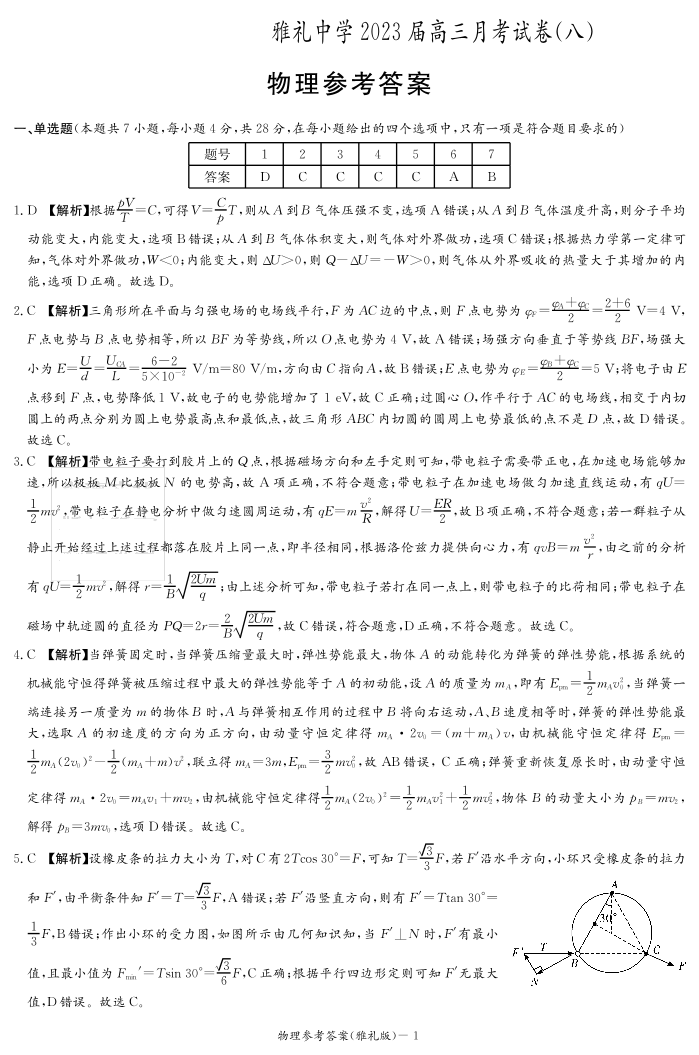 高三物理答案--湖南省长沙市雅礼中学2022-2023学年高三下学期月考(八)