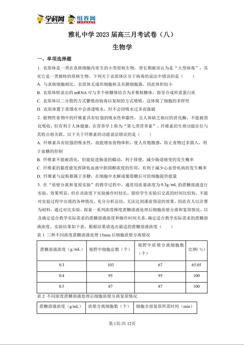 高三生物(原卷版)--湖南省长沙市雅礼中学2022-2023学年高三下学期月考(八)