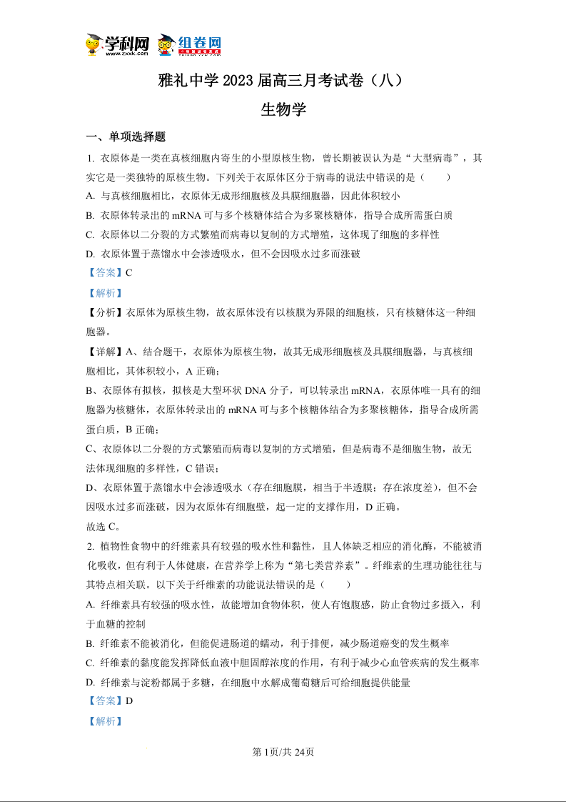 高三生物(精品解析版)--湖南省长沙市雅礼中学2022-2023学年高三下学期月考(八)