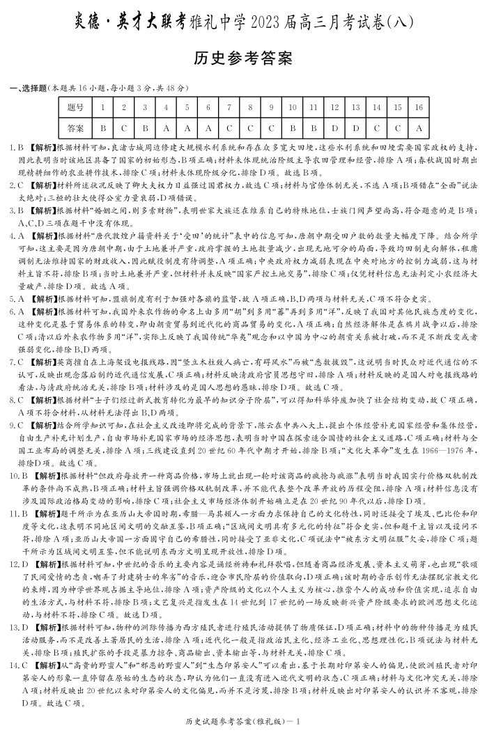 高三历史答案--湖南省长沙市雅礼中学2022-2023学年高三下学期月考(八)