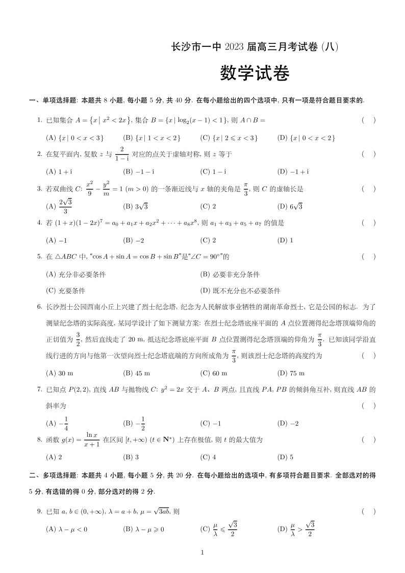 高三数学--湖南省长沙市第一中学2022-2023学年高三下学期月考(八)