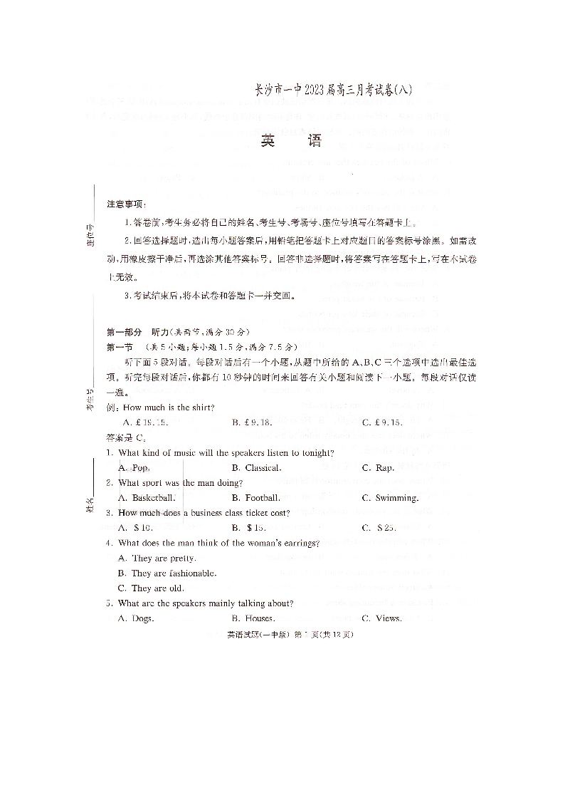 高三英语--湖南省长沙市第一中学2022-2023学年高三下学期月考(八)