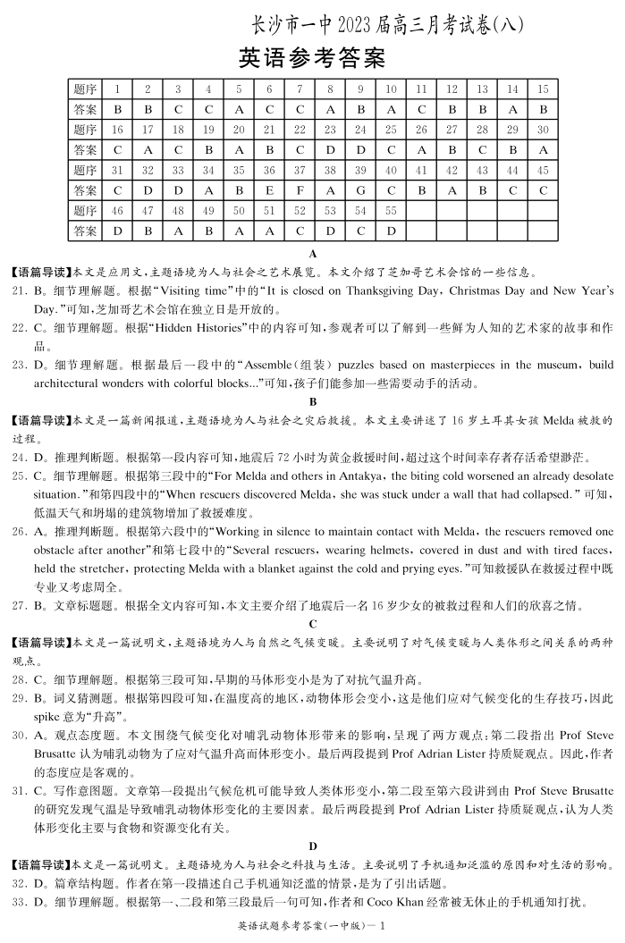 高三英语答案--湖南省长沙市第一中学2022-2023学年高三下学期月考(八)