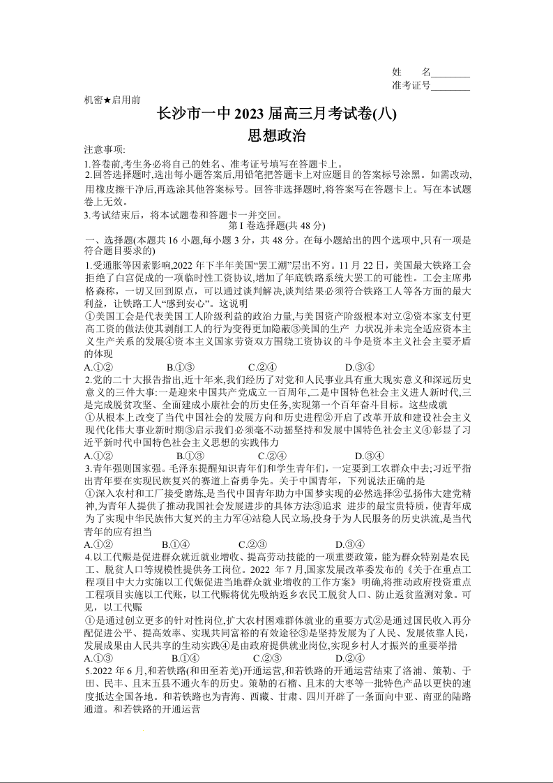 高三政治--湖南省长沙市第一中学2022-2023学年高三下学期月考(八)