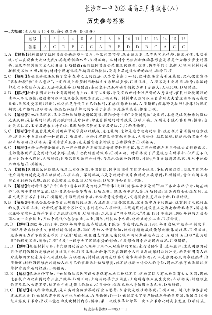 高三历史答案--湖南省长沙市第一中学2022-2023学年高三下学期月考(八)