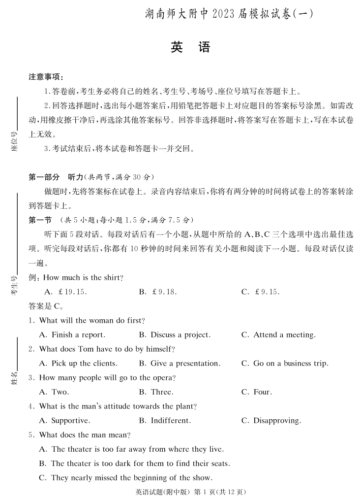 高三英语--湖南省长沙市湖南师范大学附属中学2023届高三下学期模拟检测(一)