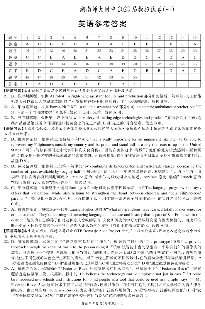 高三英语答案--湖南省长沙市湖南师范大学附属中学2023届高三下学期模拟检测(一)