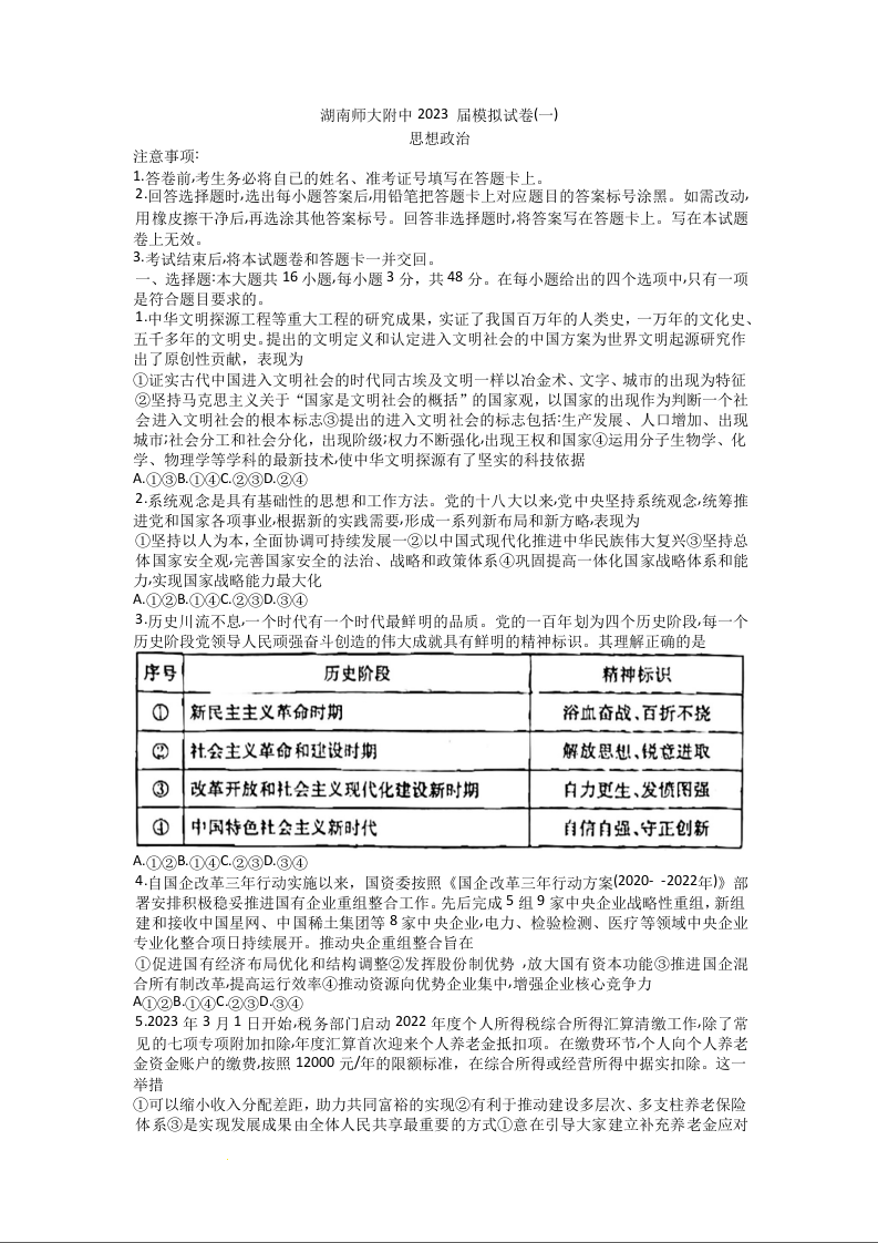 高三政治+答案--湖南省长沙市湖南师范大学附属中学2023届高三下学期模拟检测(一)