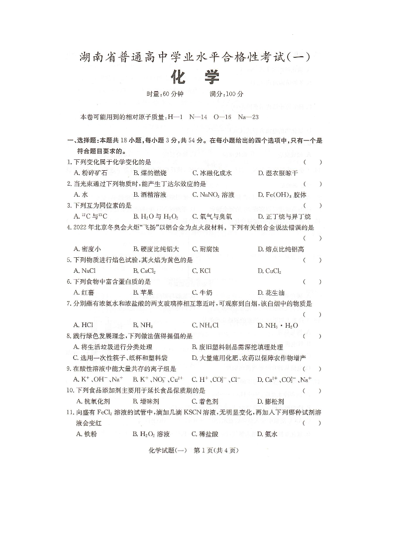 高三化学+答案--湖南省2023年普通高中学业水平合格性考试(一)