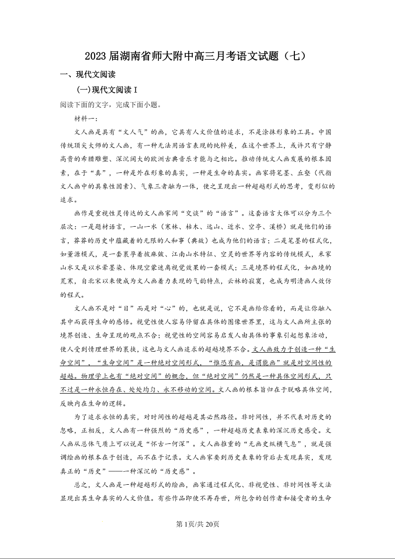 高三语文(精品解析版)--湖南省师大附中炎德英才2023届高三月考(七)
