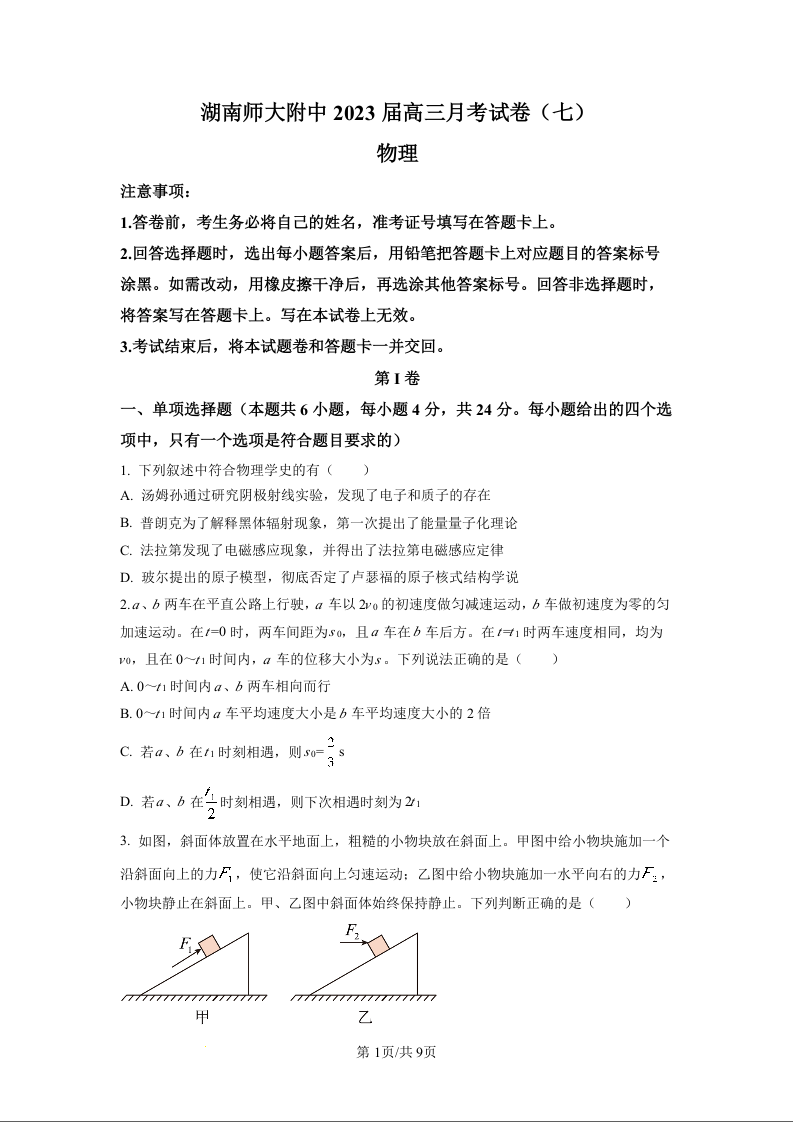 高三物理(原卷版)--湖南省师大附中炎德英才2023届高三月考(七)