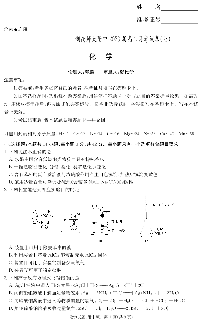 高三化学--湖南省师大附中炎德英才2023届高三月考(七)
