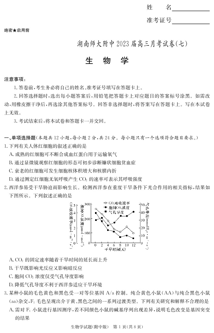 高三生物--湖南省师大附中炎德英才2023届高三月考(七)