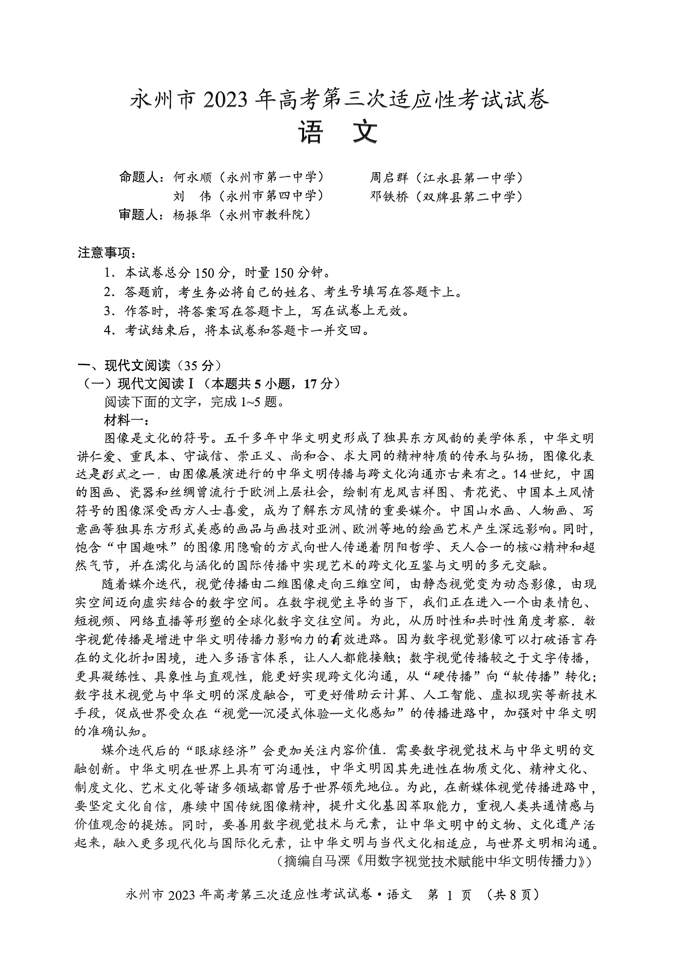 高三语文--湖南省永州市2023届高考第三次适应性考试