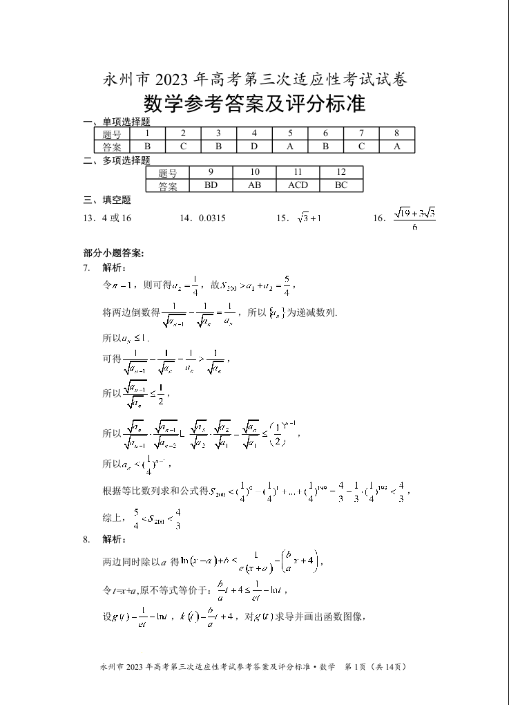 高三数学答案--湖南省永州市2023届高考第三次适应性考试