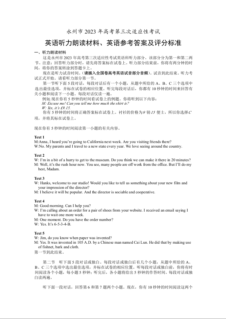 高三英语--湖南省永州市2023届高考第三次适应性考试