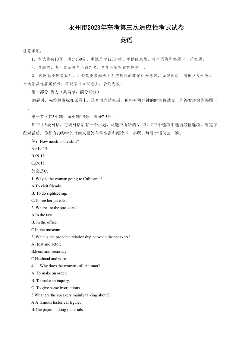 高三英语答案--湖南省永州市2023届高考第三次适应性考试