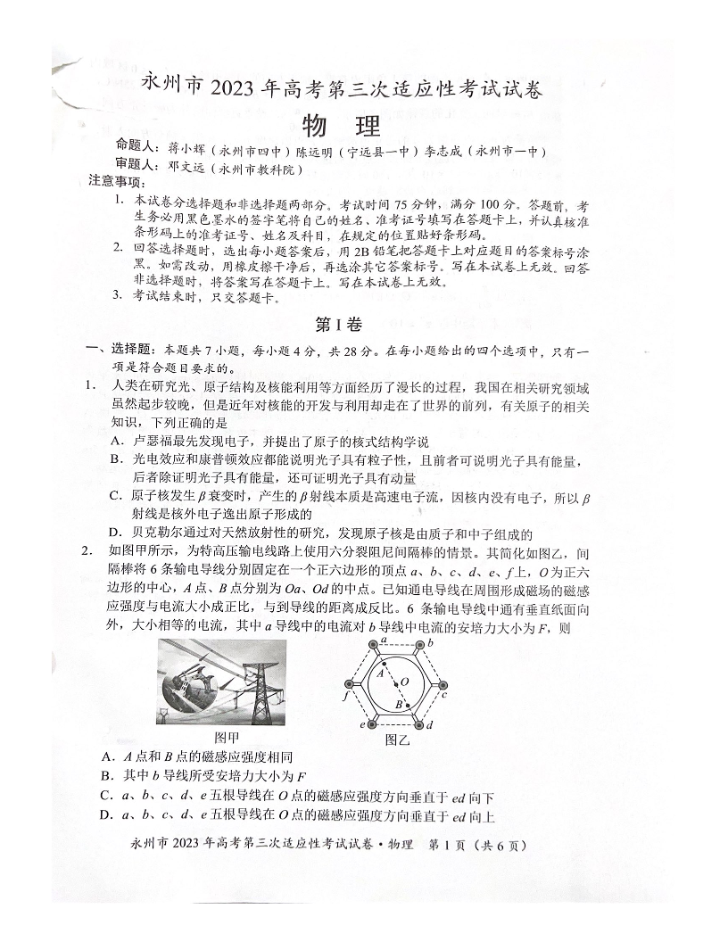高三物理--湖南省永州市2023届高考第三次适应性考试