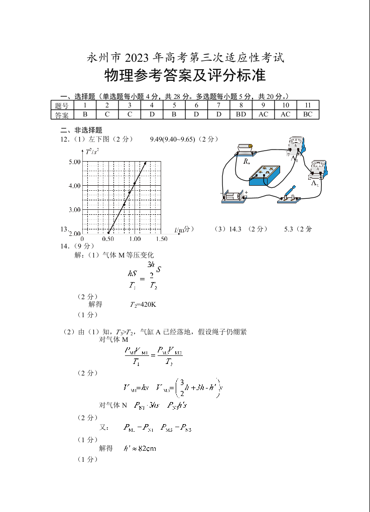 高三物理答案--湖南省永州市2023届高考第三次适应性考试