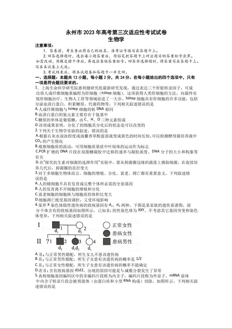 高三生物--湖南省永州市2023届高考第三次适应性考试