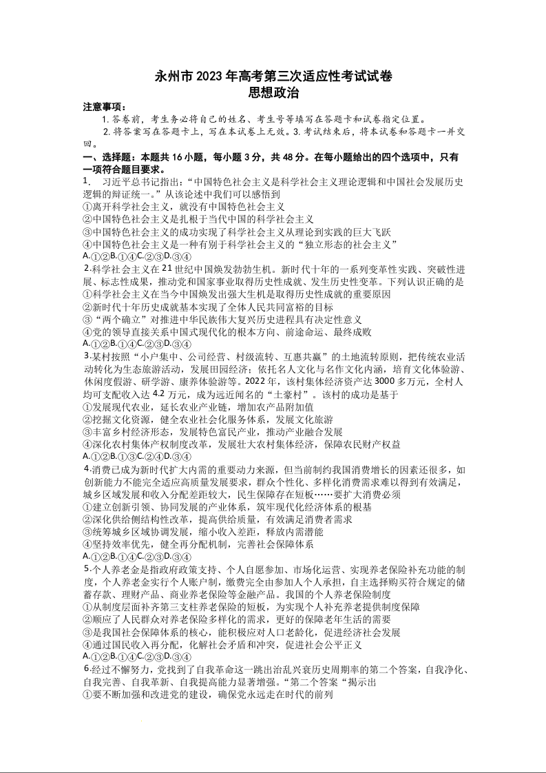 高三政治+答案--湖南省永州市2023届高考第三次适应性考试
